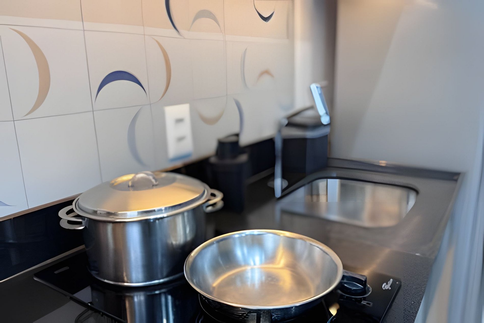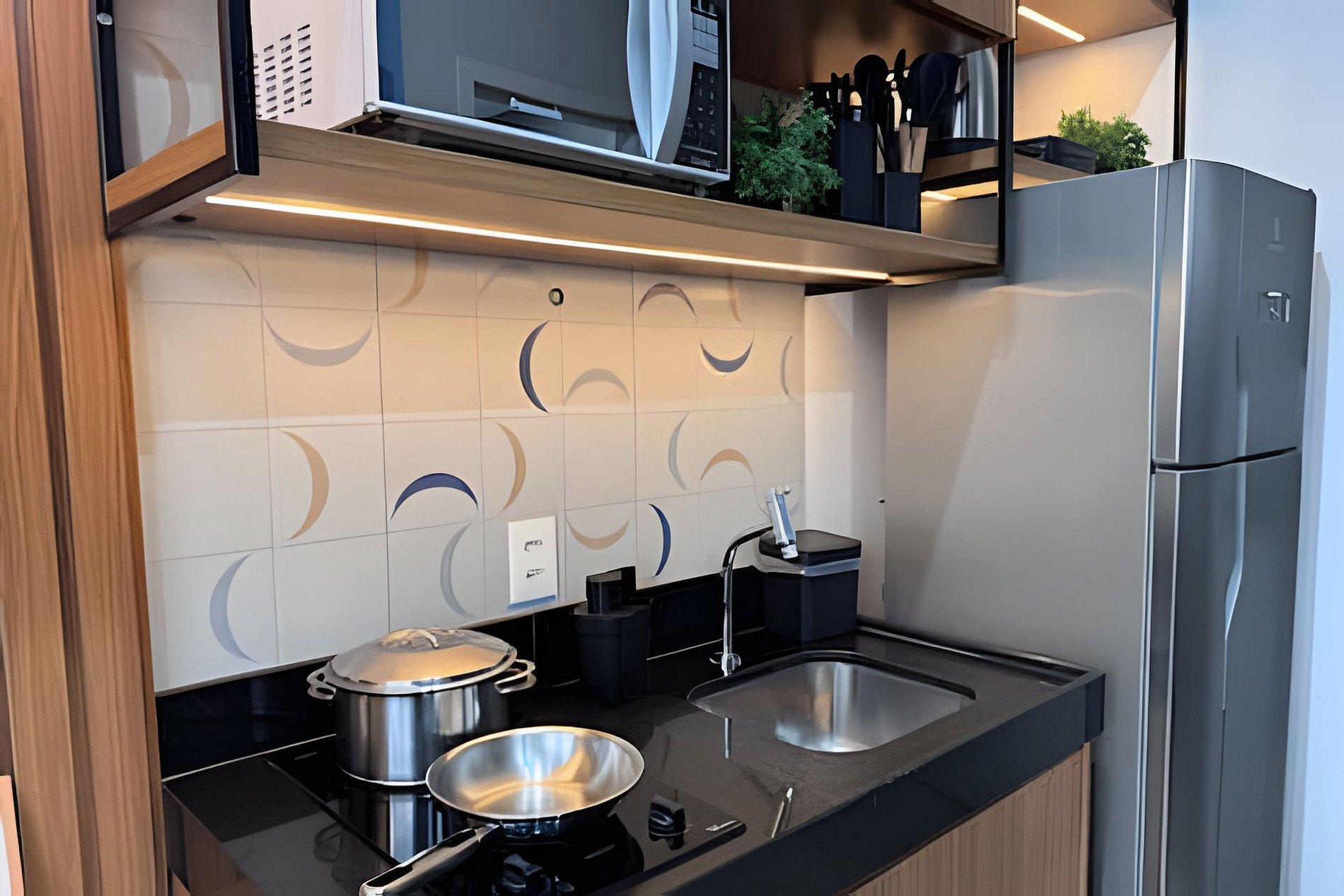 • Cozinha equipada com cooktop, micro-ondas, torradeira, cafeteira/chaleira, utensílios e panelas