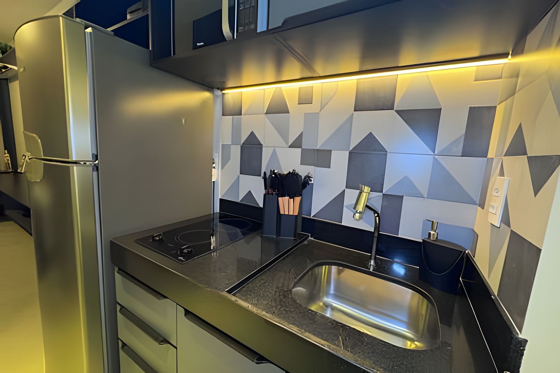 • Cozinha totalmente equipada com utensílios, panelas e eletrodomésticos como sanduicheira, cooktop, geladeira, máquina de café, chaleira e etc..