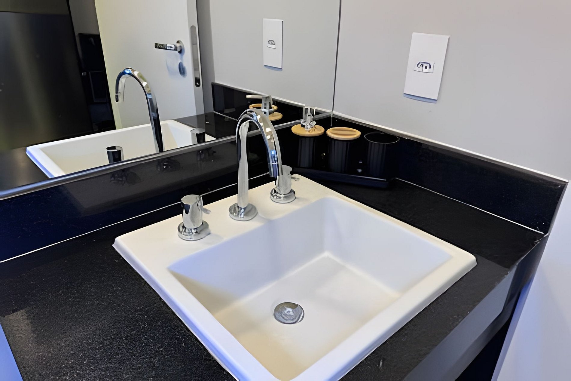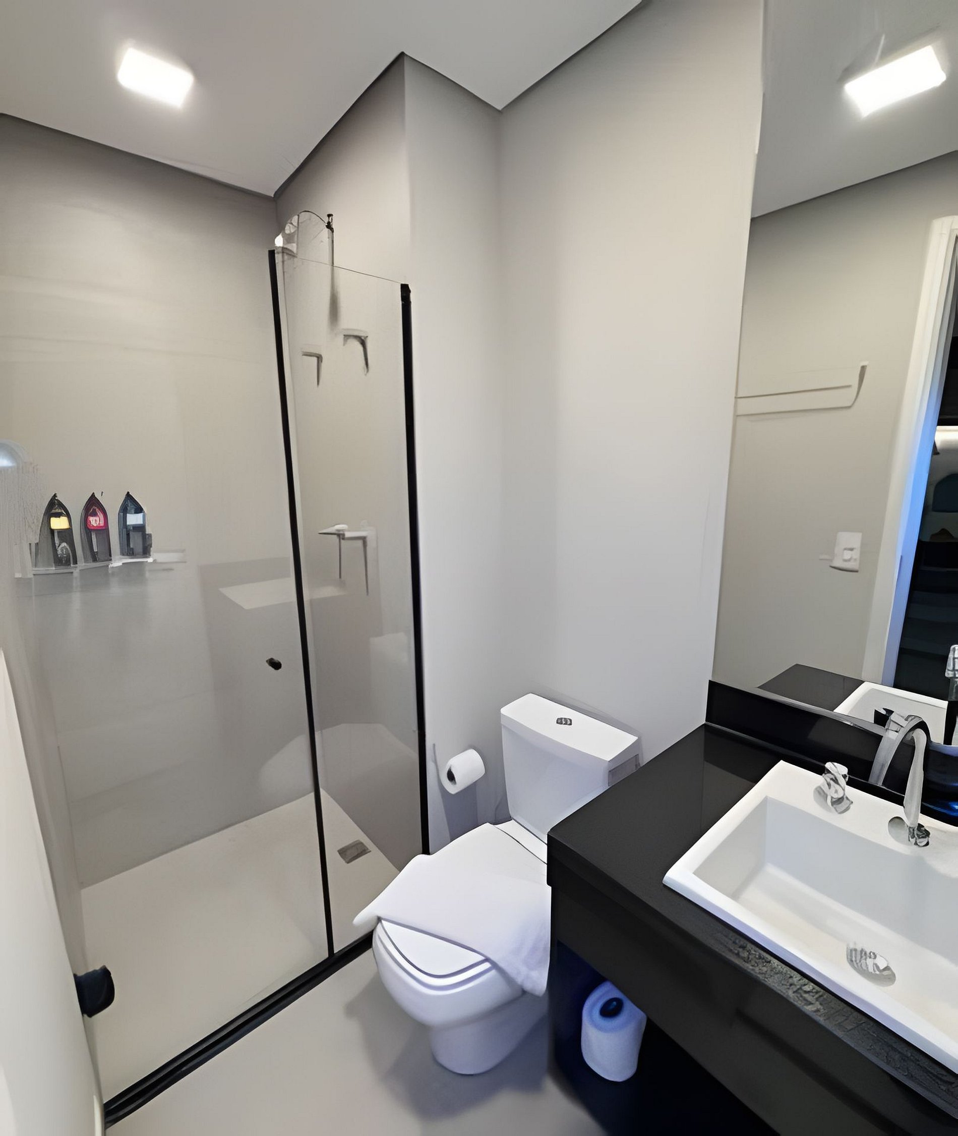 • Banheiro privativo com ducha quente, toalhas de banho e rosto e itens básicos de higiene como papel higiênico, sabonete líquido, shampoo e condicionador.