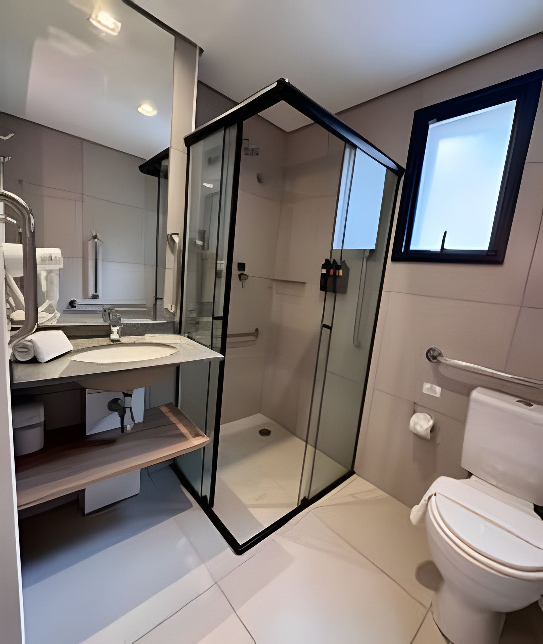 • Banheiro privativo com ducha quente, toalhas de banho e rosto e itens básicos de higiene