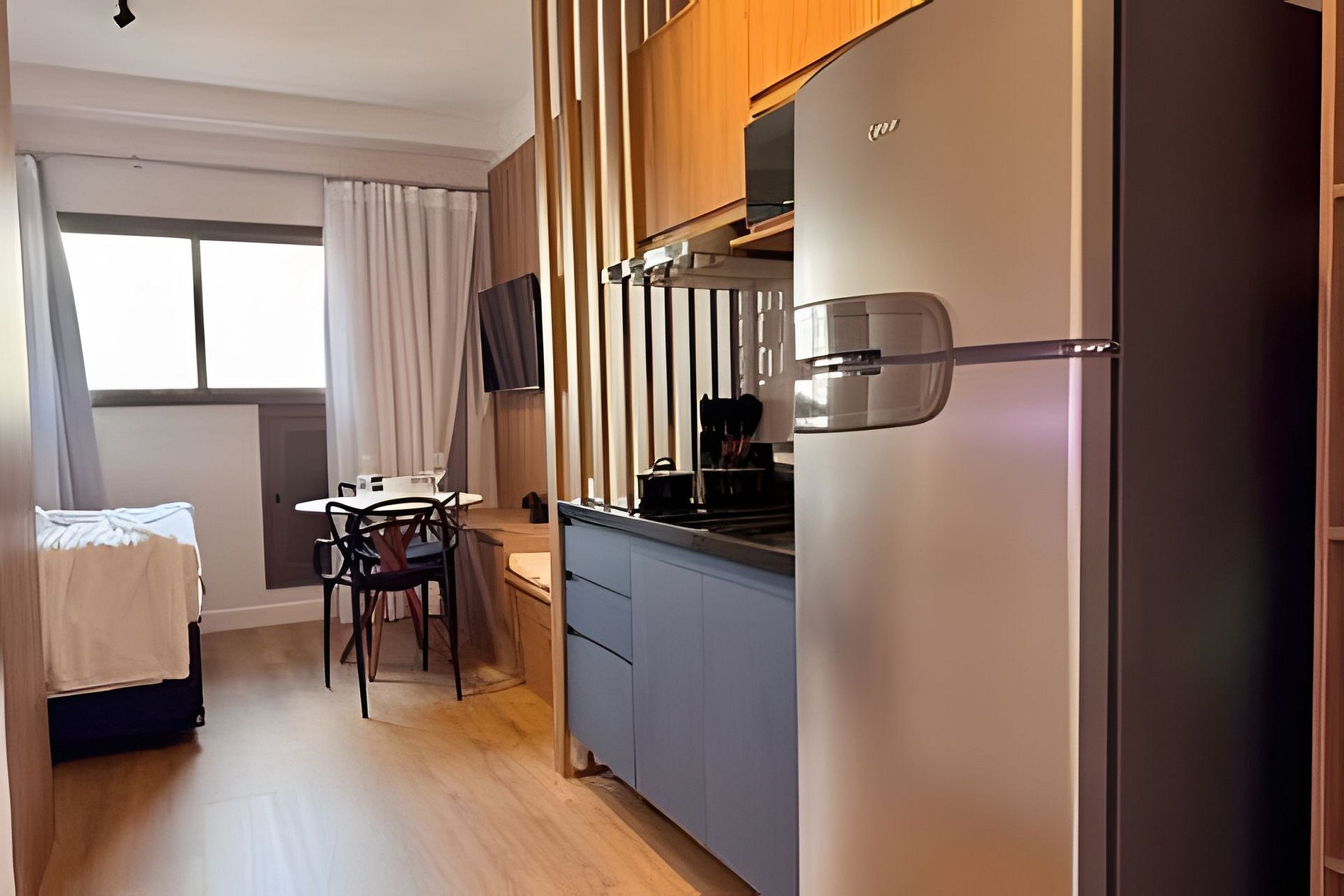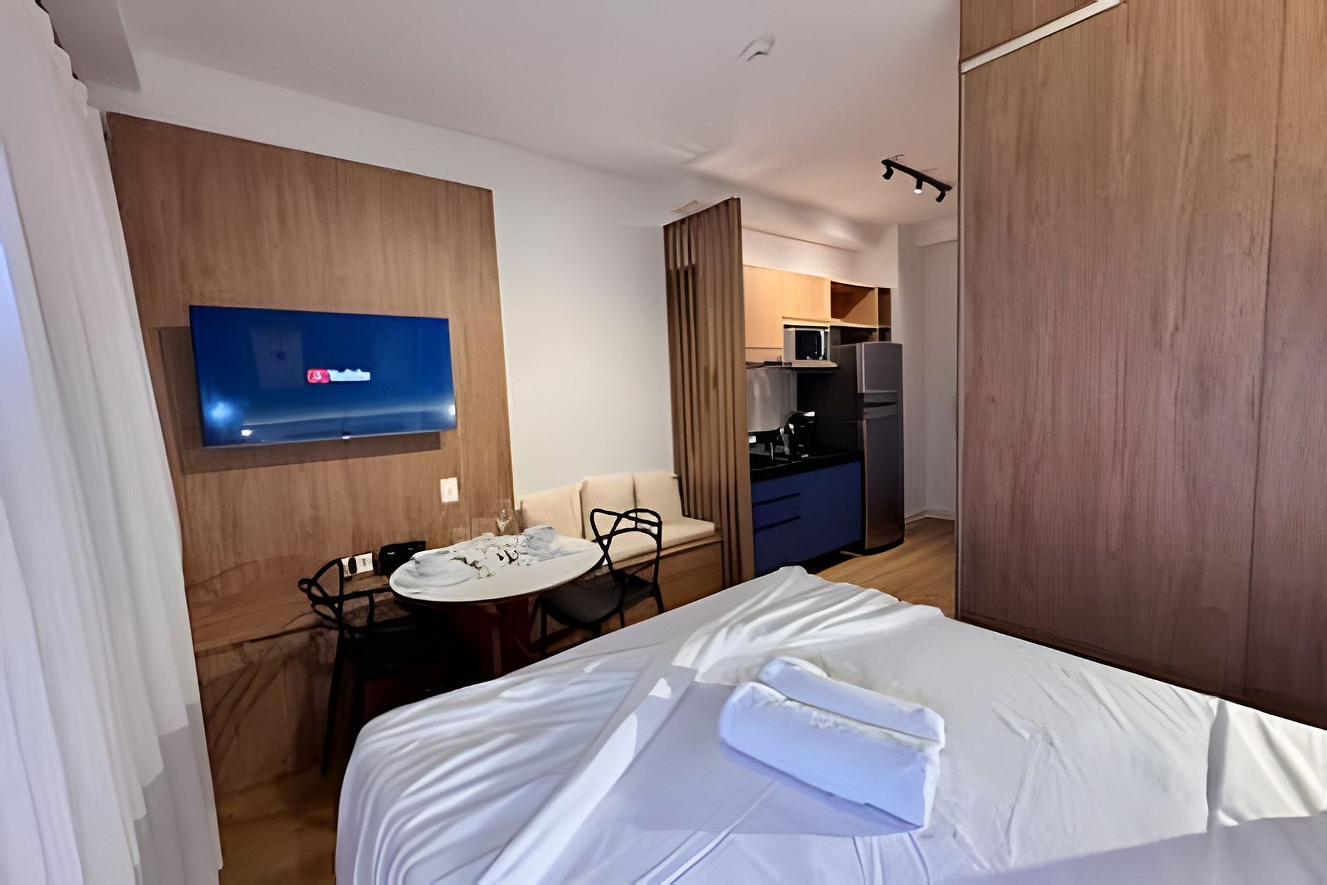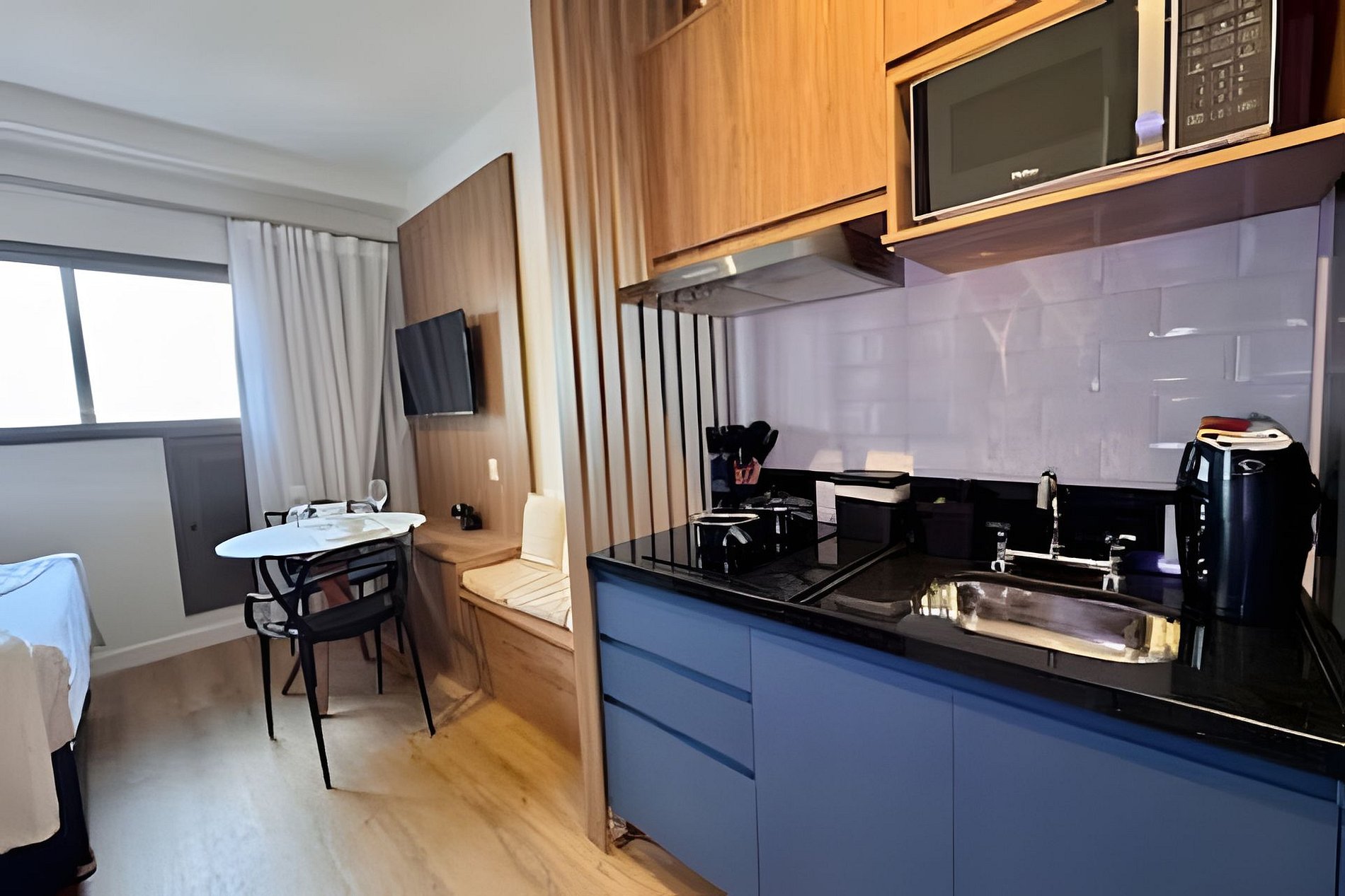 Os studios possuem aproximadamente 24m², com ambiente moderno, funcional e bem planejado, ideal para até 2 hóspedes — perfeito para casais, executivos ou viajantes que buscam conforto e praticidade em uma excelente localização.