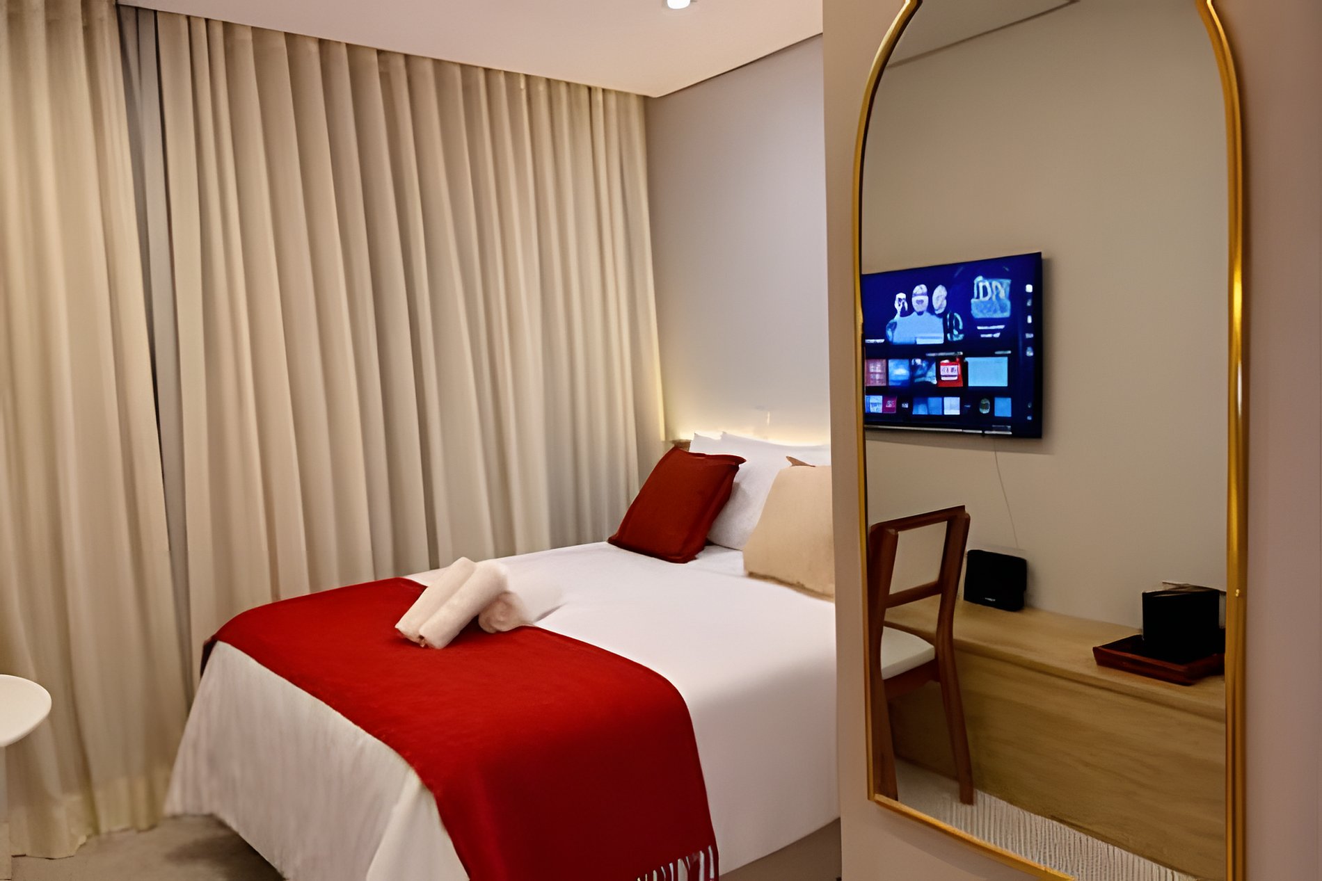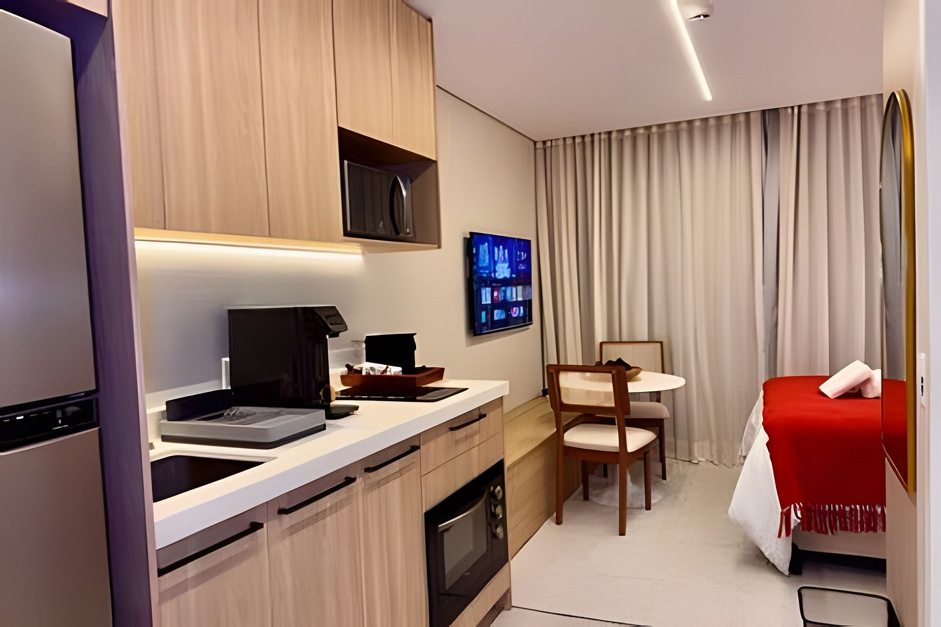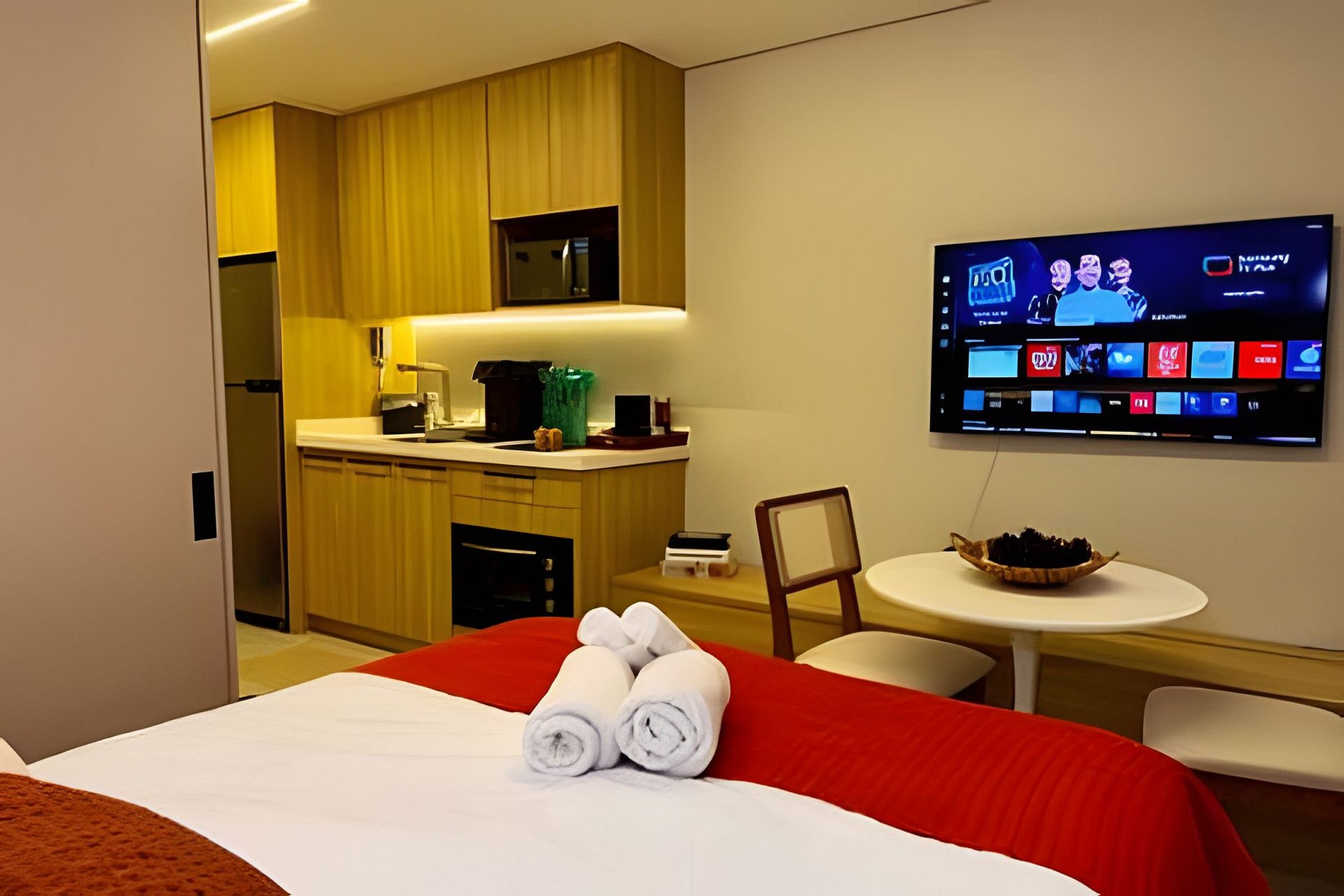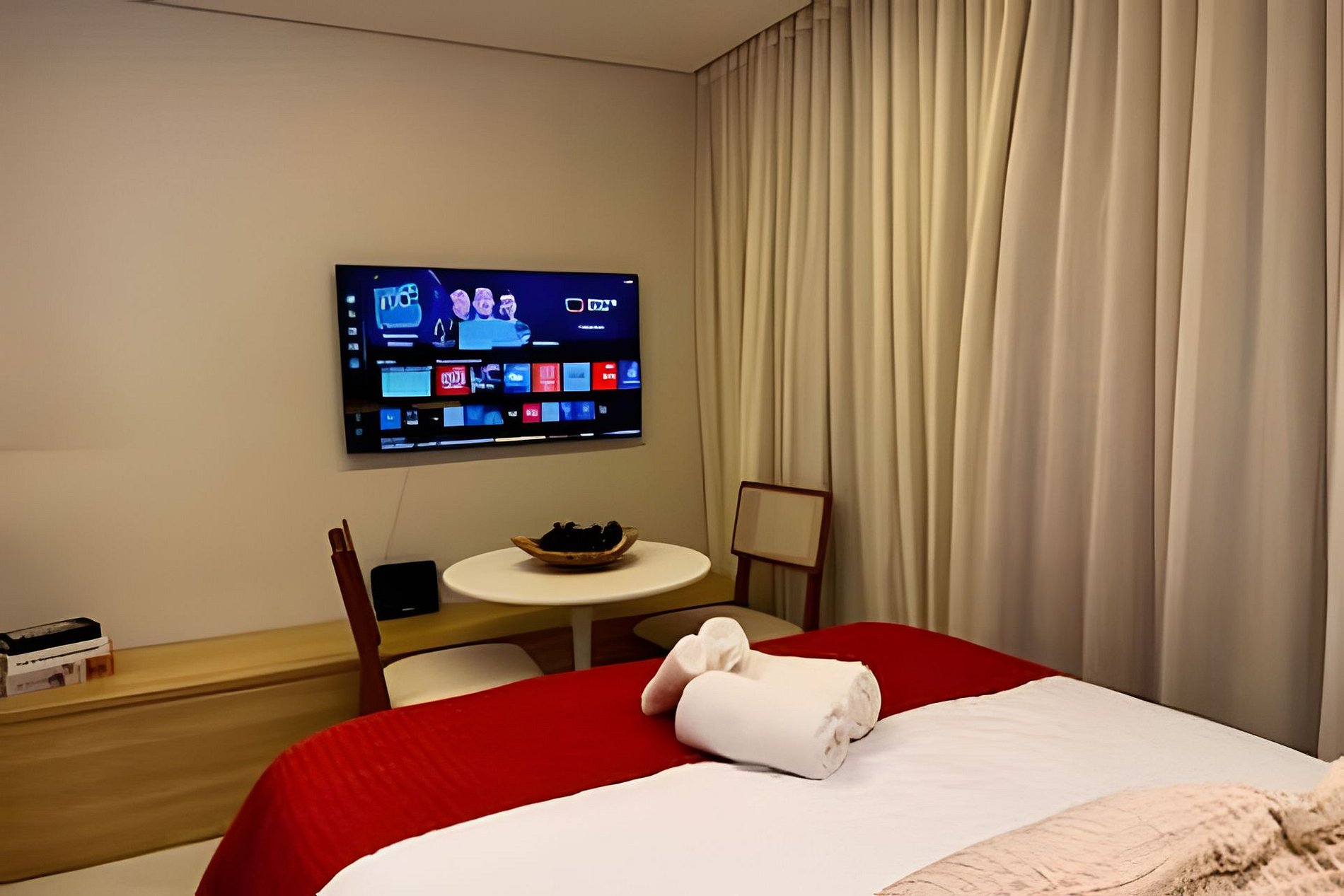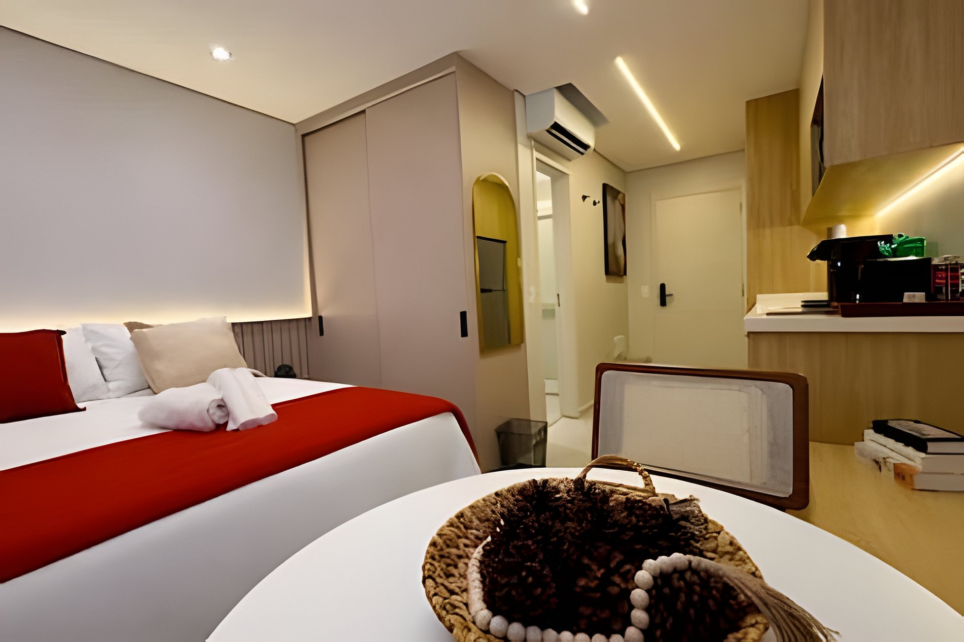 Os studios possuem aproximadamente 24m², com ambiente moderno, funcional e bem planejado, ideal para até 2 hóspedes — perfeito para casais, executivos ou viajantes que buscam conforto e praticidade em uma excelente localização.