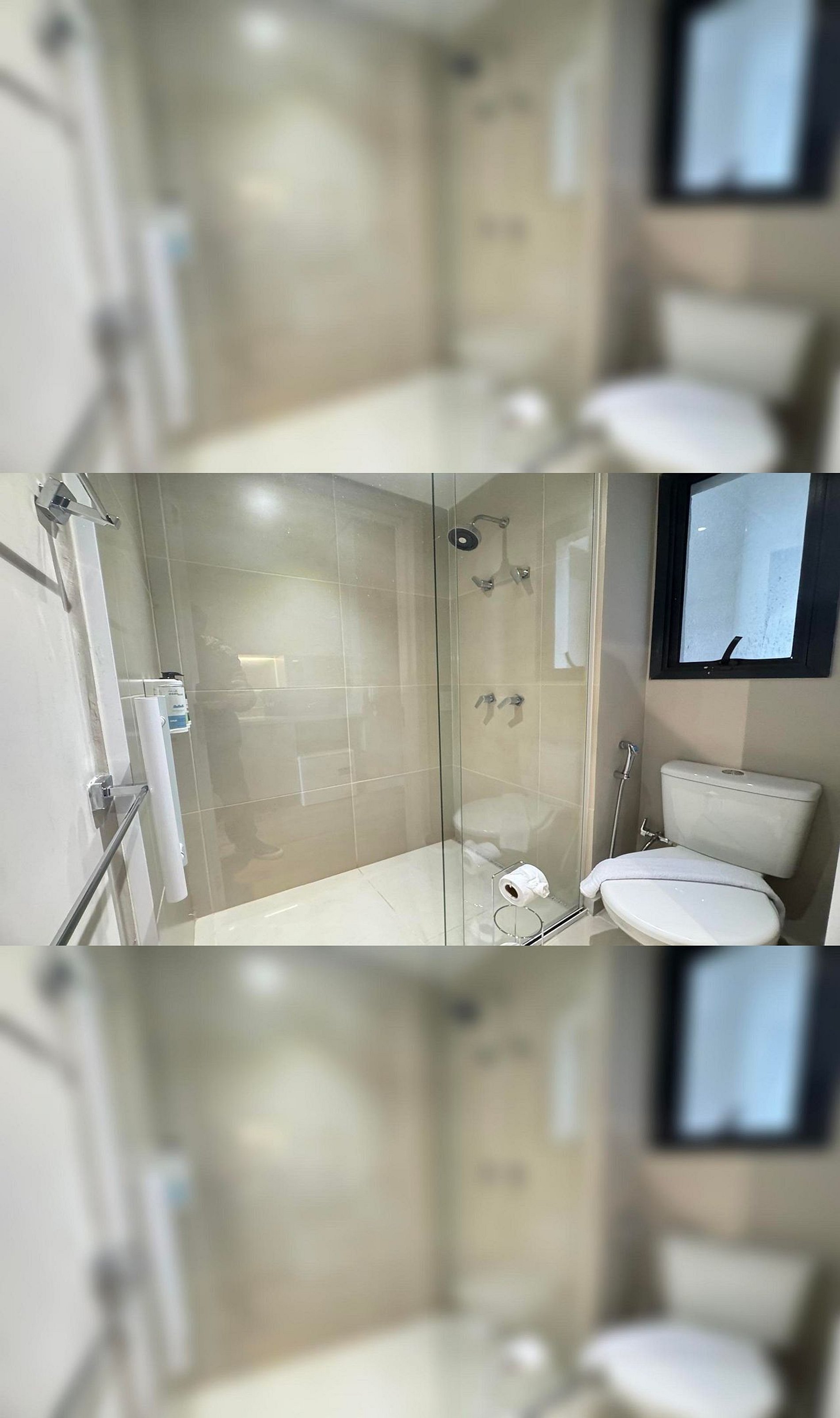 • Banheiro moderno com ducha potente, toalhas de banho e rosto e itens básicos de higiene
