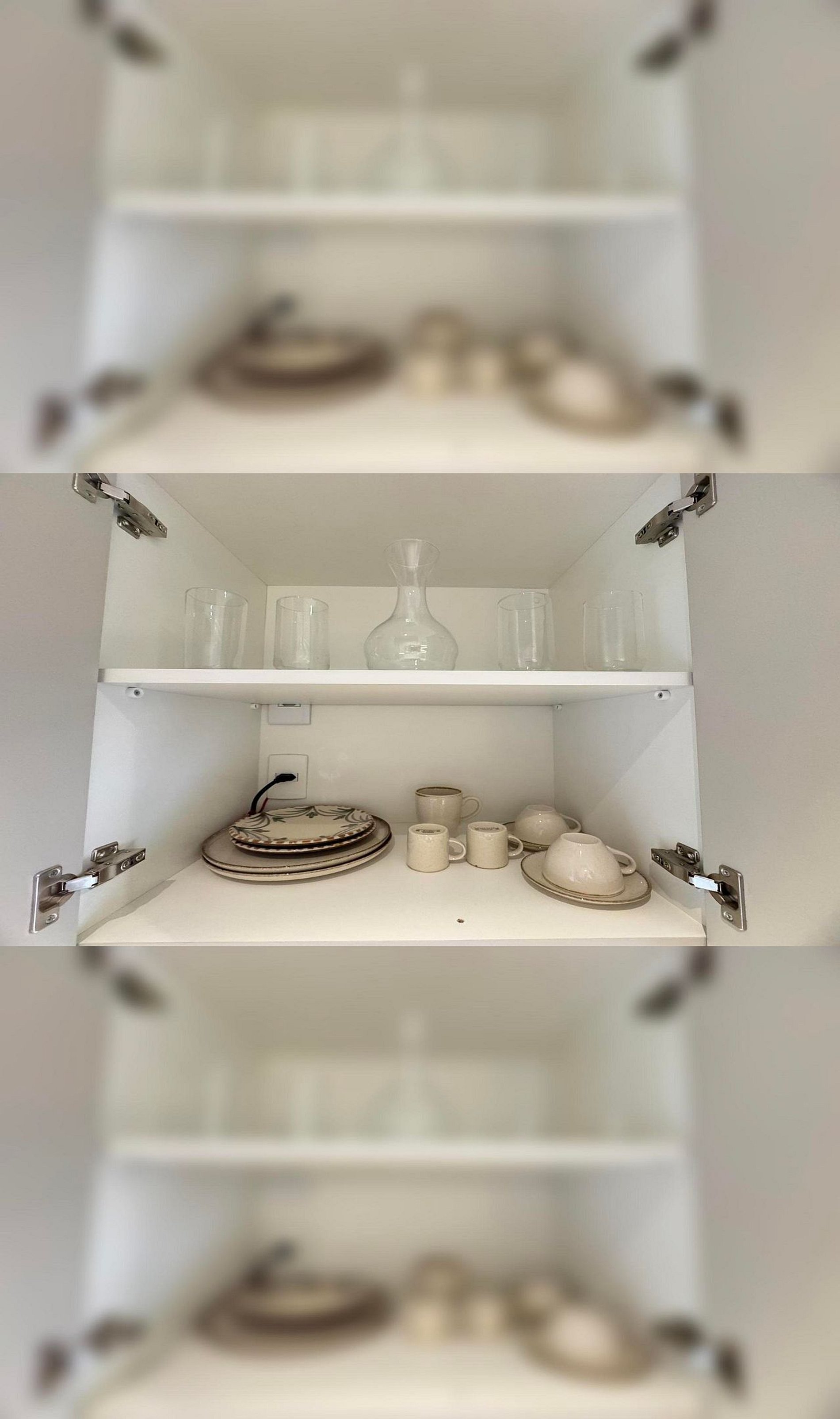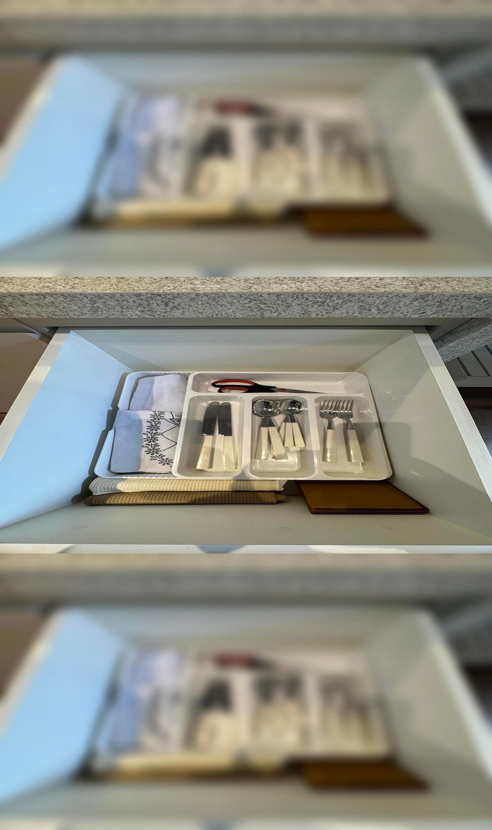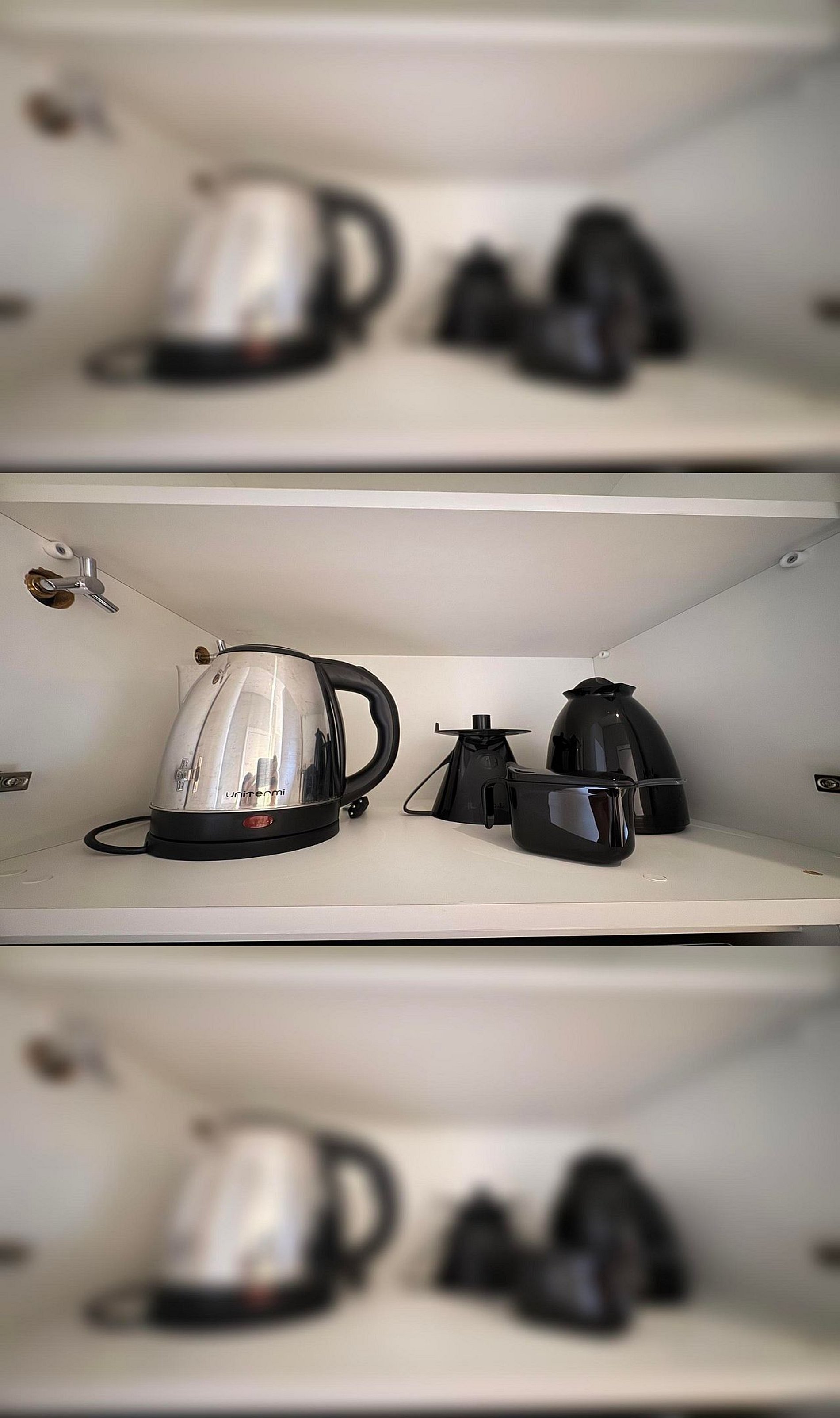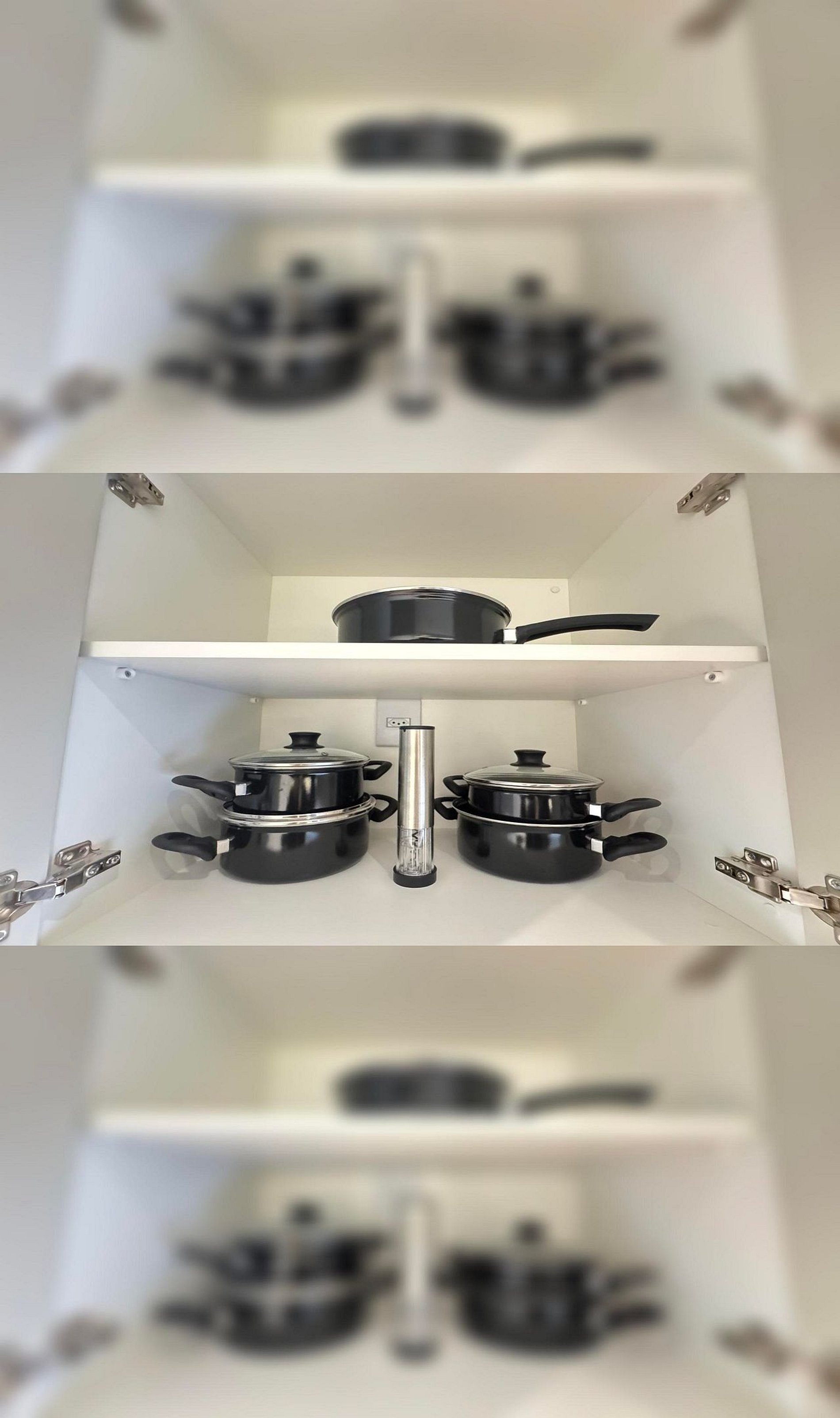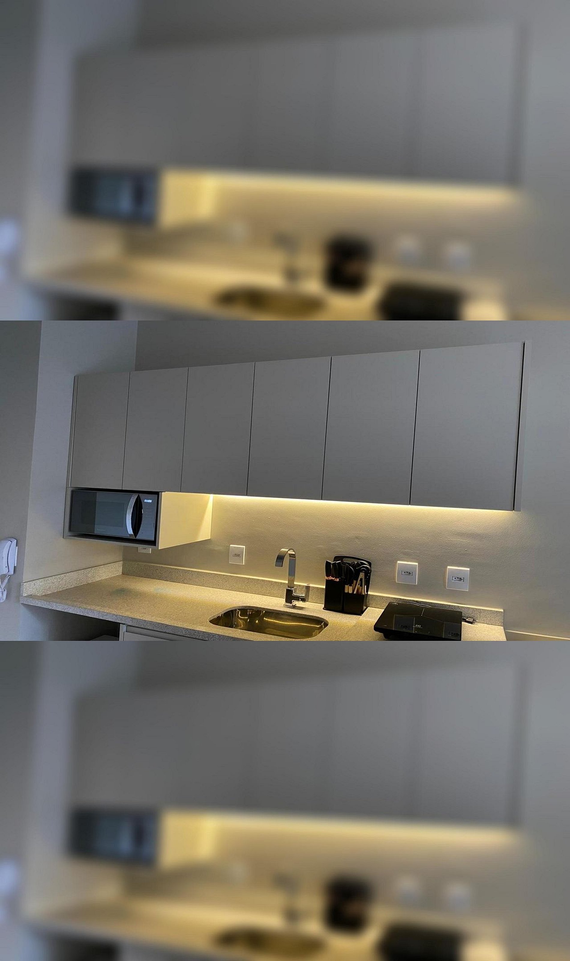 • Cozinha compacta equipada com micro-ondas, cooktop, geladeira, cafeteira, panelas e utensílios essenciais